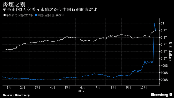 下面是彭博社绘制的一张图表,苹果走向1万亿美元市值之路与中石油形成天壤之别: