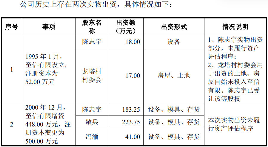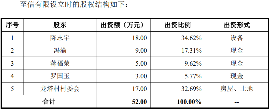 发行人的前身至信有限成立于1995年1月,注册资本为52.00万元,其中陈志宇以设备出资18.00万元,龙塔村村委会以土地、房屋出资17.00万元,冯渝以货币出资9.00万元,蒋福荣以货币出资5.00万元,罗国玉以货币出资3.00万元。