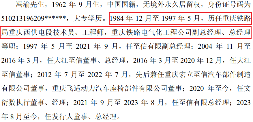公司的总经理为创始股东之一冯渝,其1997年5月开始在公司担任副总经理,也在此前,在重庆铁路系统就职,曾担任重庆铁路电气化工程公司副总经理、总经理等职。