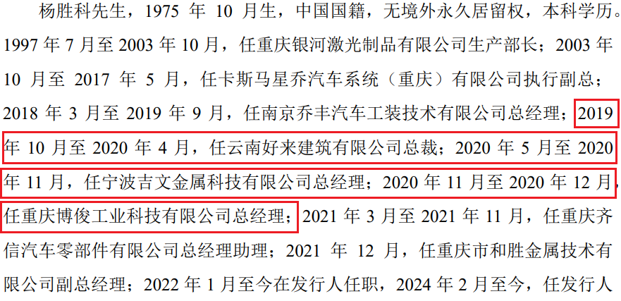 招股书显示,杨胜科2022年1月加入公司,在2024年2月开始担任发行人副总经理,其履历显示,2019年10月至2020年4月,任云南好来建筑有限公司总裁,2020年5月至2020年11月,任宁波吉文金属科技有限公司总经理,2020年11月至2020年12月,任重庆博俊工业科技有限公司总经理。