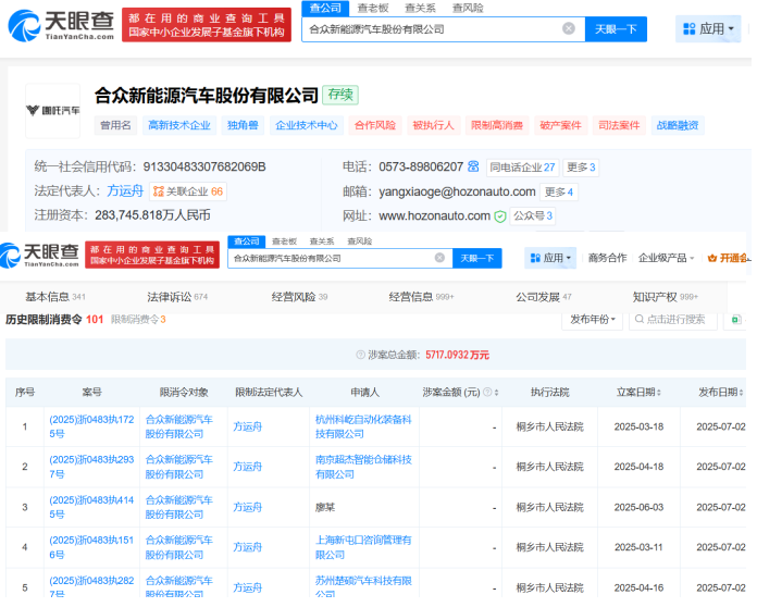 天眼查显示,合众新能源汽车自2024年12月以来列入被执行人115次,被执行总额约2.28亿元,被法院出具限制消费令101次,涉案总额5,700多万,2025年8月,被广州市珠海区法院列入“失信被执行人”。