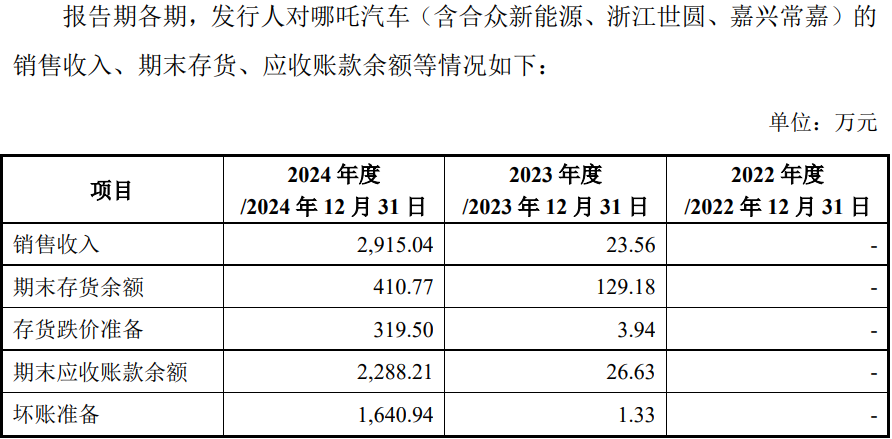 2023年度、2024年度,发行人对哪吒汽车的销售收入分别为23.56万元、2,915.04万元,期末应收账款余额分别为26.63万元、2,288.21万元,不过,公司并未全部作坏账准备。