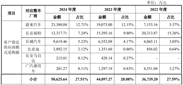 问询函显示,2022年-2024年,客户指定供应商模式下的采购额约分别为3.67亿元、4.41亿元和5.06亿元,占比分别为27.59%、28.08%和27.51%。