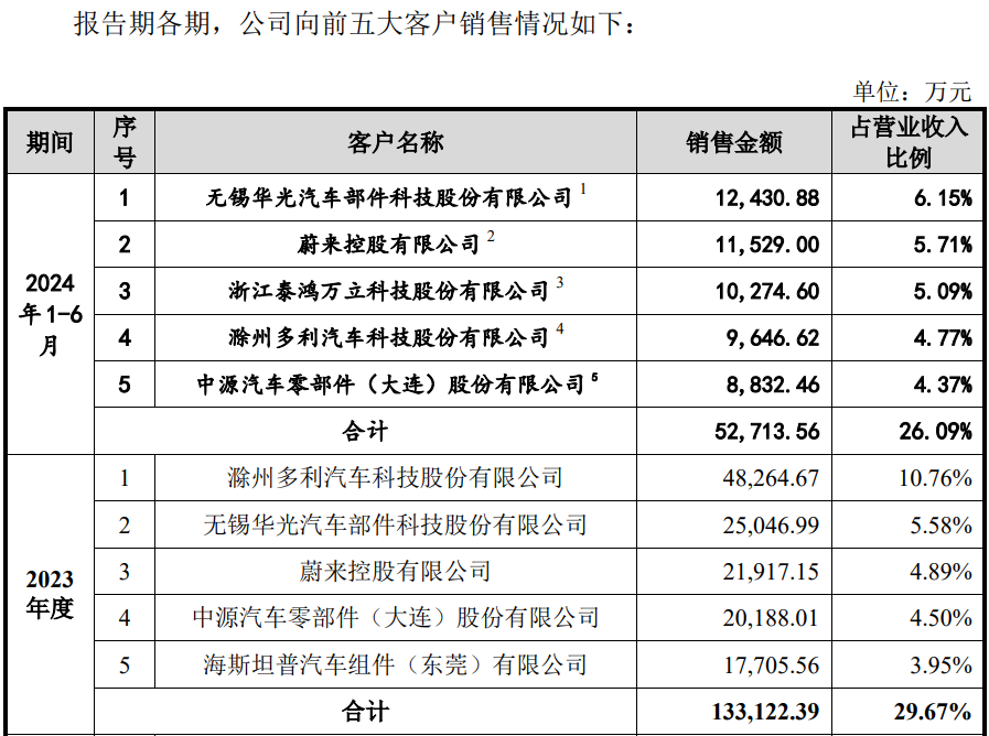 前五客户主要有长安汽车、吉利汽车、长安福特、蔚来汽车、理想汽车、比亚迪等整车厂商,其中,一半以上收入来自于长安汽车、吉利汽车,报告期内,该两家车企为发行人前两大客户,对其合计销售占比分别为53.14%、56.77%、52.79%和43.15%,对两家销售占比均约在20%以上。