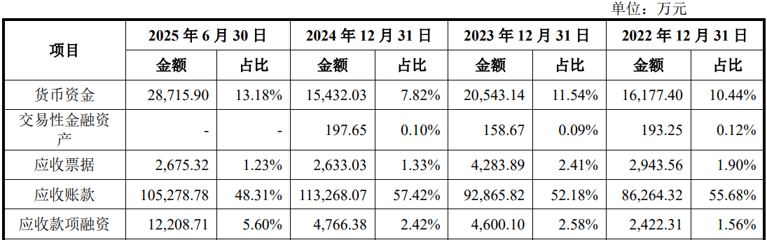 对大客户的依赖,也导致了公司应收账款的高企。2022年末、2023年末、2024年末和2025年6月末,发行人应收账款账面价值分别为86,264.32万元、92,865.82万元、113,268.07万元和105,278.78万元,占当期流动资产的比例分别为55.68%、52.18%、57.42%和48.31%,占当期营业收入的比例分别为41.25%、36.23%、36.68%和65.63%。