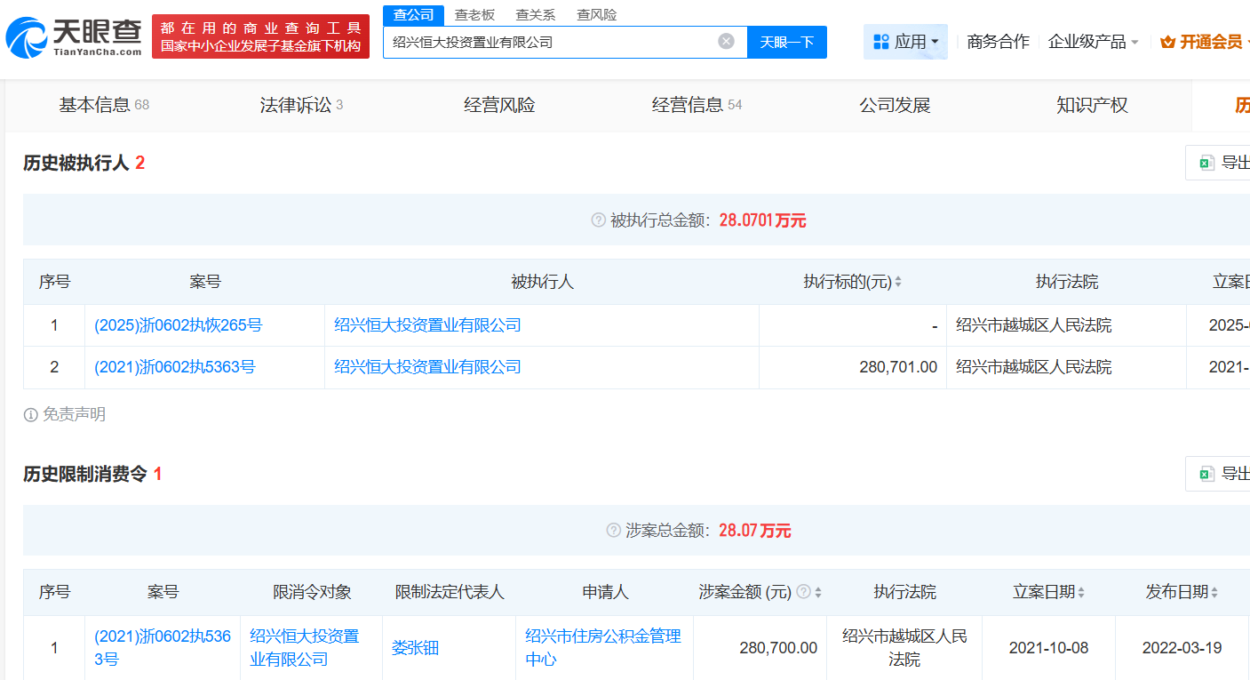 同时,娄张钿也曾因其控制的绍兴恒大投资置业有限公司被一起列入限制消费人员。