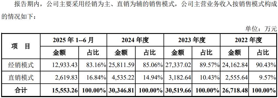 公司以经销模式为主、直销模式为辅开展销售活动。报告期内,公司经销模式产生的收入约分别为2.42亿元、2.73亿元、2.58亿元和1.29亿元,占主营业务收入的比重分别为90.43%、89.57%、85.06%和83.16%,占比较高。