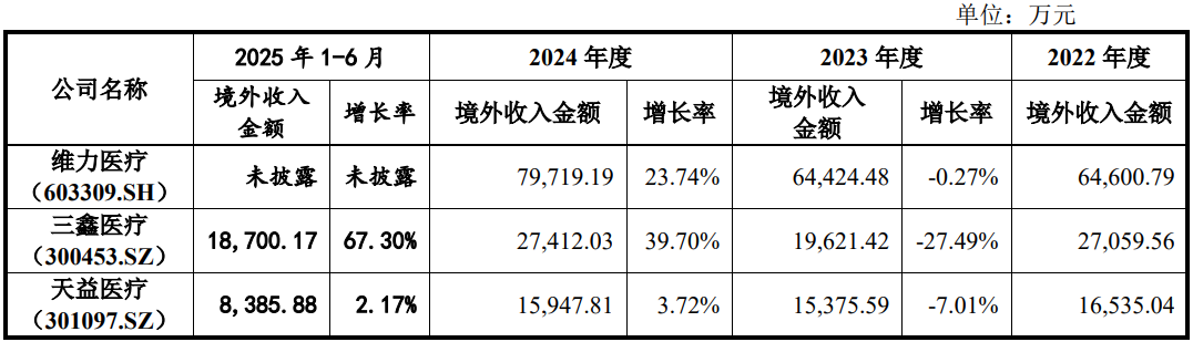 报告期内,公司境外收入分别为2,292.96万元、2,848.63万元、3,951.10万元和2,135.01万元,2023年、2024年增长率分别为24.23%、38.70% ,在同行中较高,尤其是2023年,同行均呈现负增长,公司独自增长了24.23%。
