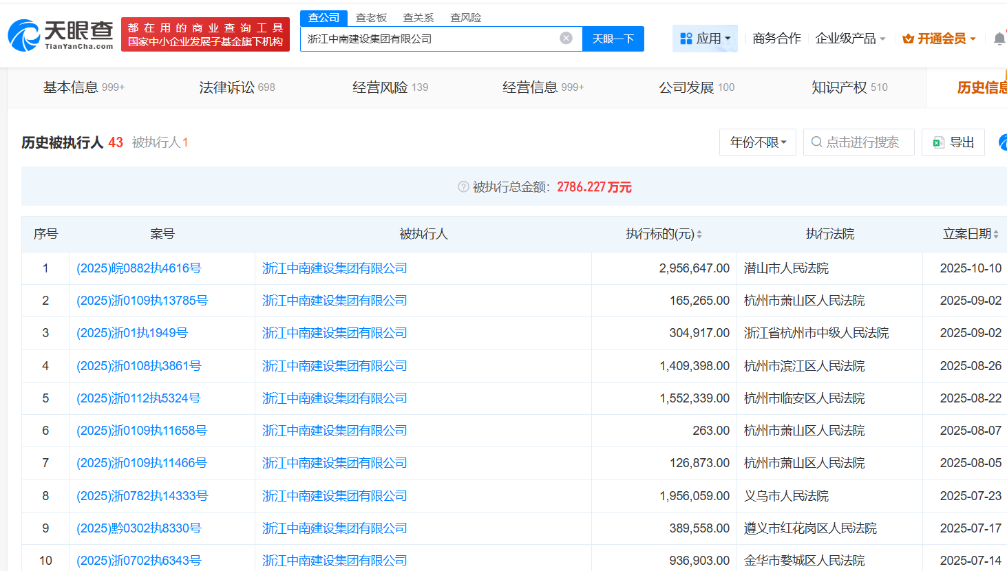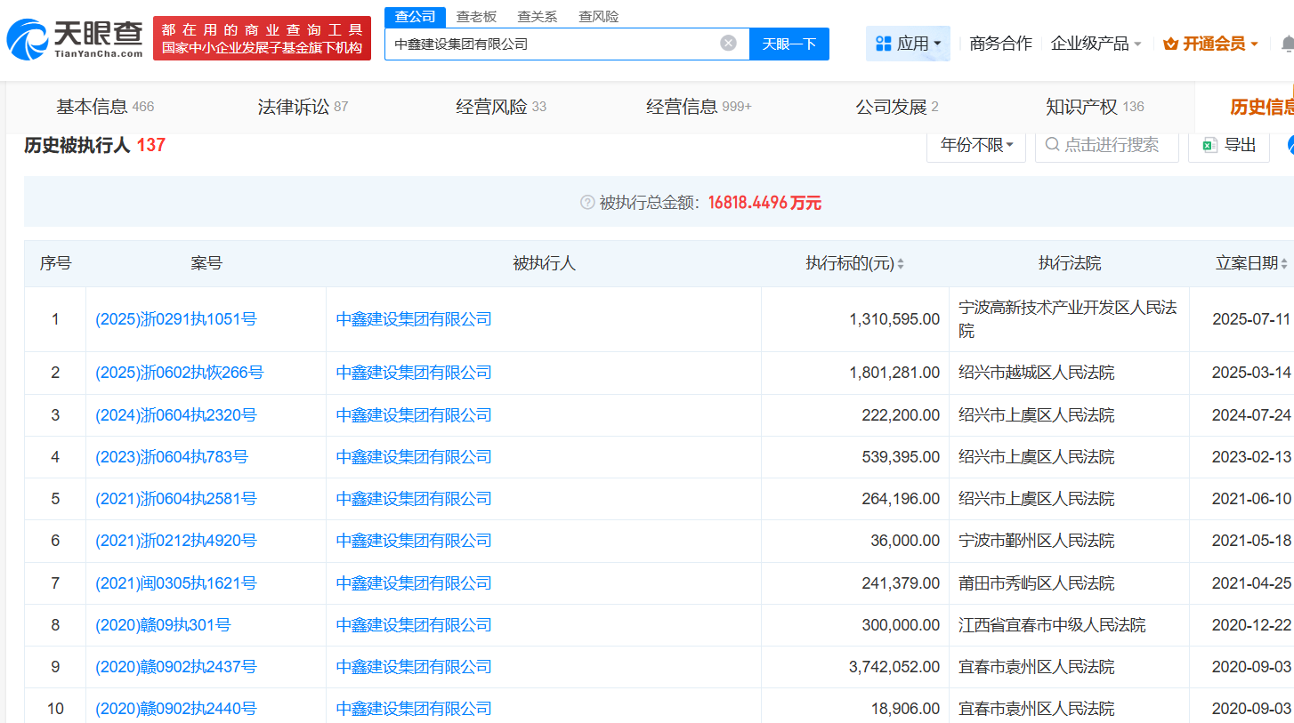 天眼查显示,中鑫建设集团涉及司法案件715起,作为被告541起涉案总额2.38亿元,纳入被执行人137起,被执行总额约1.68亿元,2021年5月,曾被宁波市鄞州区人民法院出具了限制消费令。浙江中南建设集团涉及司法案件518起,作为被告401起涉案金额3160.56万元,纳入被执行人43起,被执行总额约2,786.23万元,该企业存在22起行政处罚被罚金额46万元,其中涉7起环保处罚,2025年7月,玉环市税务局玉城税务所公布其拖欠税款10.3万元。