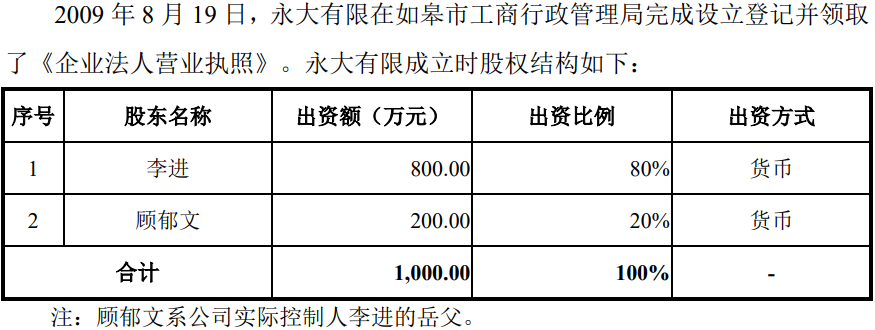 公司前身南通市永大化工机械有限公司(简称“永大有限”)设立于2009年8月,其中李进认缴800万元,占公司注册资本80%,顾郁文认缴200万元,占公司注册资本20%。