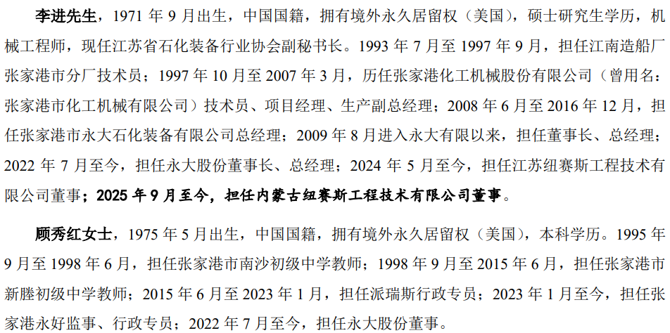 2008年,李进设立张家港市永大石化装备有限公司、2009年设立发行人,均从事与张化工相似或相同的业务,李进同时担任该两家企业的总经理。根据其履历显示,李进及其妻子顾秀红均拥有美国永久居留权,李进担任公司董事长兼总经理、顾秀红担任董事。
