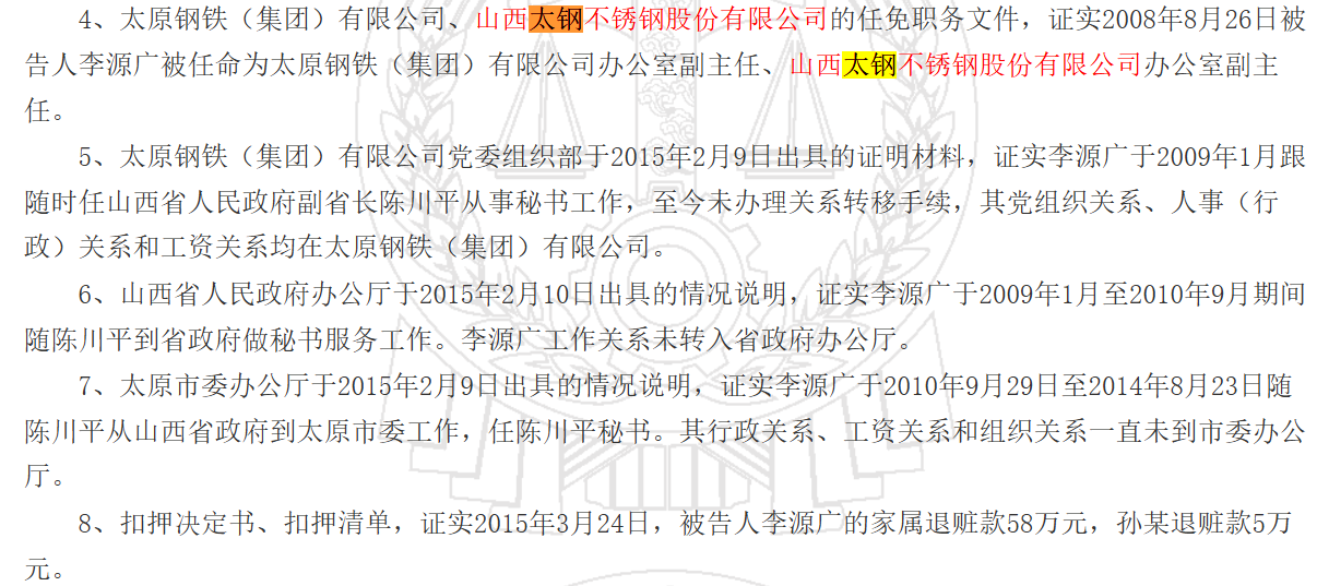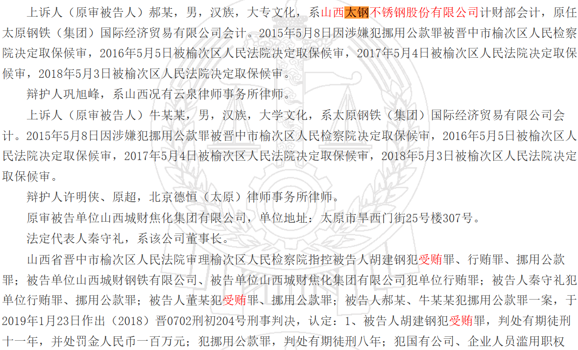 裁判文书网中《胡建钢、山西城财钢铁有限公司受贿、行贿、挪用公款二审刑事裁定书》、《李源广利用影响力受贿罪二审刑事裁定书》《张书峰再审刑事判决书》显示,山西太钢不锈钢股份有限公司涉多起员工受贿侵占案。