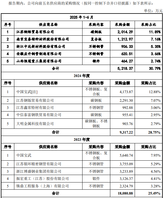 公司的前五供应商主要有中国宝武、江苏钢铄贸易、大明金属、宝泰特种材料、江苏银环精密钢管等。