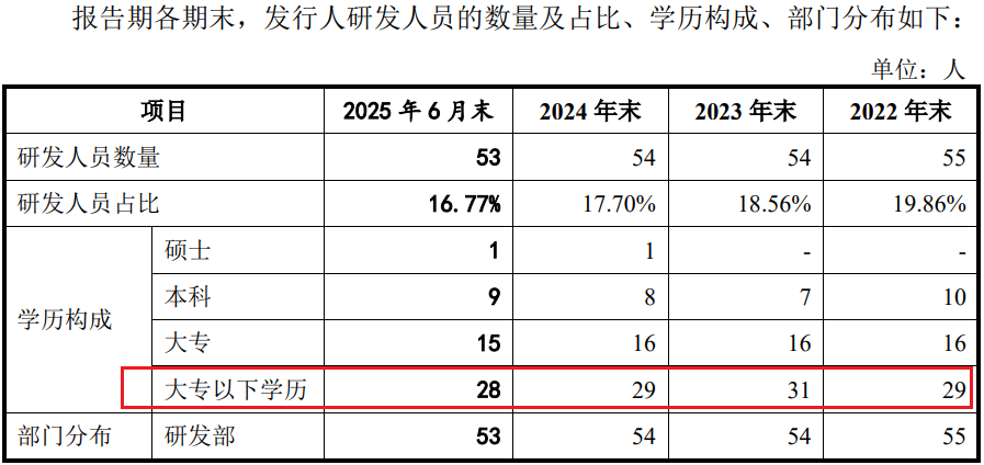 从研发人员的受教育程度来看,超一半为大专以下学历,占比较高。