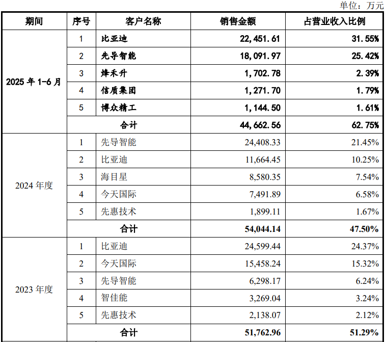 公司的前五客户主要为比亚迪、先导智能、海目星、今天国际和先惠技术等,2022年,公司对比亚迪的销售金额约5.09亿元,占比49.32%,不过在2023年-2025年1-6月对其销售金额快速下滑,对其他前五客户的销售金额快速增加。
