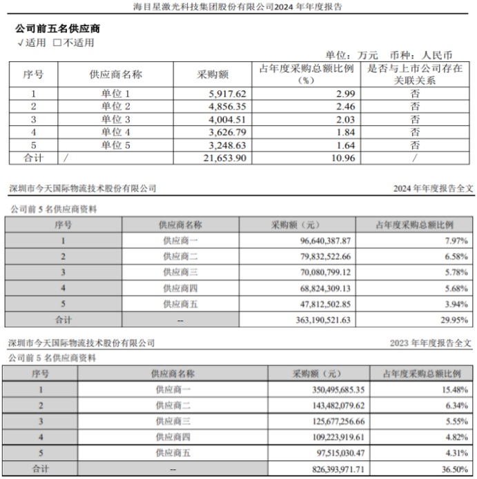 同时,招股书显示,2024年对第三客户海目星的销售数据为8,580.35万元,而其年报数据对一供应商的采购数据为5,917.62万元,发行人销售数据多出2,662.73万元。2024年对第四客户今天国际的销售数据为7,491.89万元,其对供应商的采购额也并无此数据,与其第二、第三供应商采购数据均相差400多万。