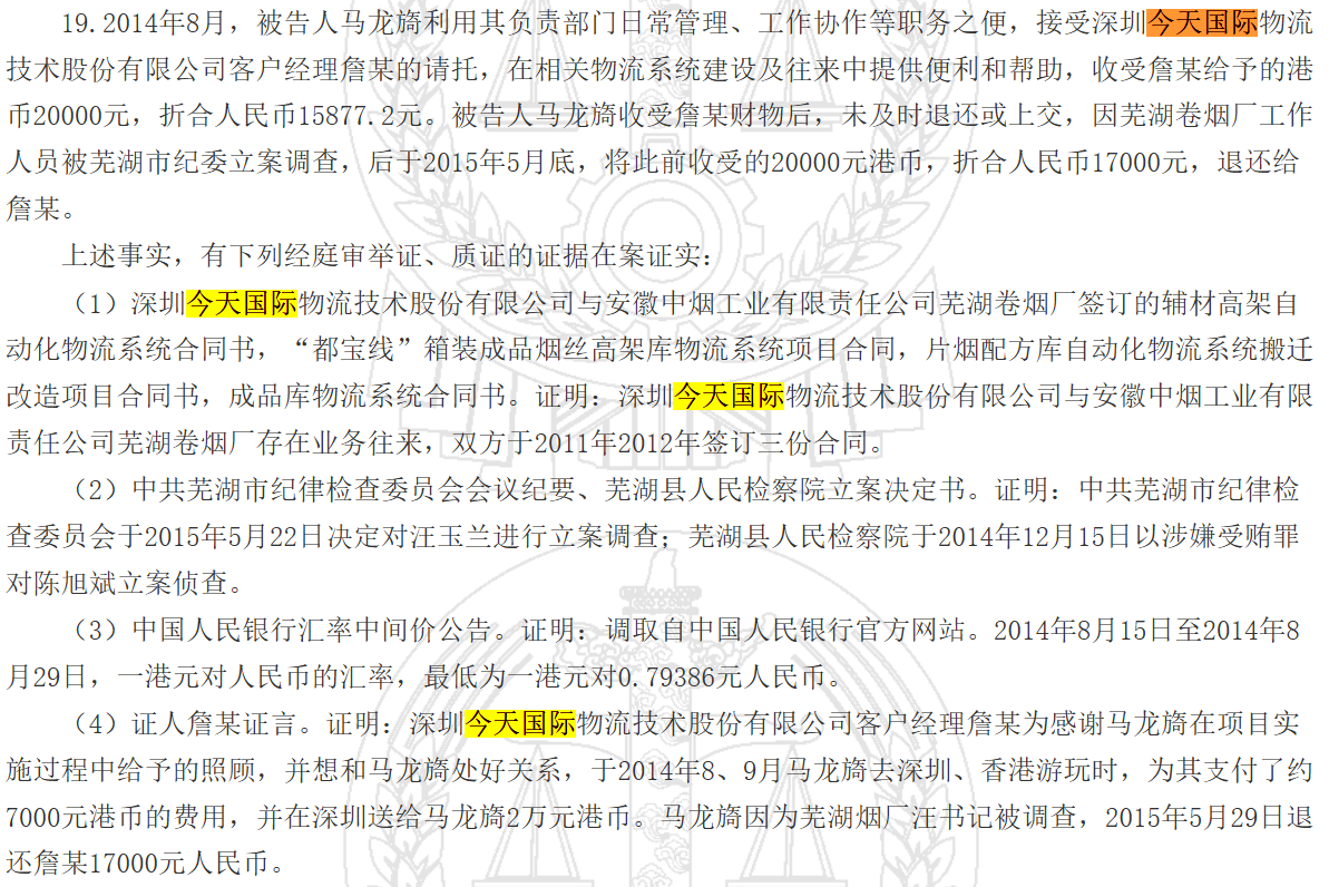据安徽省芜湖经济技术开发区人民法院发布的案号为(2015)芜经开刑初字第00100号的《马龙旖受贿一审刑事判决书》显示,原安徽中烟工业有限责任公司芜湖卷烟厂技改办主任马龙旖利用其负责部门日常管理、工作协作等职务之便,接受深圳今天国际物流技术股份有限公司客户经理詹某的请托,在相关物流系统建设及往来中提供便利和帮助,收受詹某给予的港币20,000元,折合人民币15,877.2元。