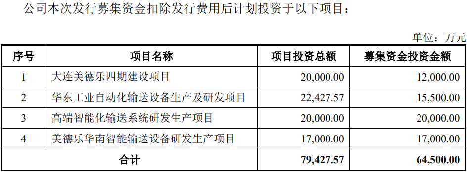 招股书披露,公司此次募资6.45亿元,用于大连美德乐四期建设项目、华东工业自动化输送设备生产及研发项目、高端智能化输送系统研发生产项目和美德乐华南智能输送设备研发生产项目。