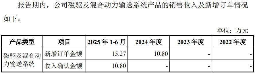 但从目前来看,公司磁驱及混合动力输送系统产品销售收入及在手订单金额较小,2022年-2024年均未形成收入,2025年上半年仅形成10.80万元的收入,新增订单仅15.27万元。