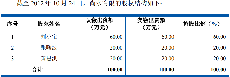 发行人前身尚水有限于2012年10月,由刘小宝、张曙波与黄思洪各出资60万、20万和20万共同投资成立。刘小宝系金旭东的亲属,为其代持,而黄思洪系为闫拥军代持。