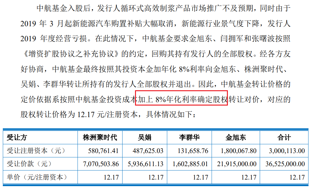问询函及招股书均称相关方向前述股东补偿进行补偿,问询函显示,相关方是按照中航基金是按照投资成本加上8%年化利率价格回购的,而招股书显示按照成本加年化利率为9%的价格。