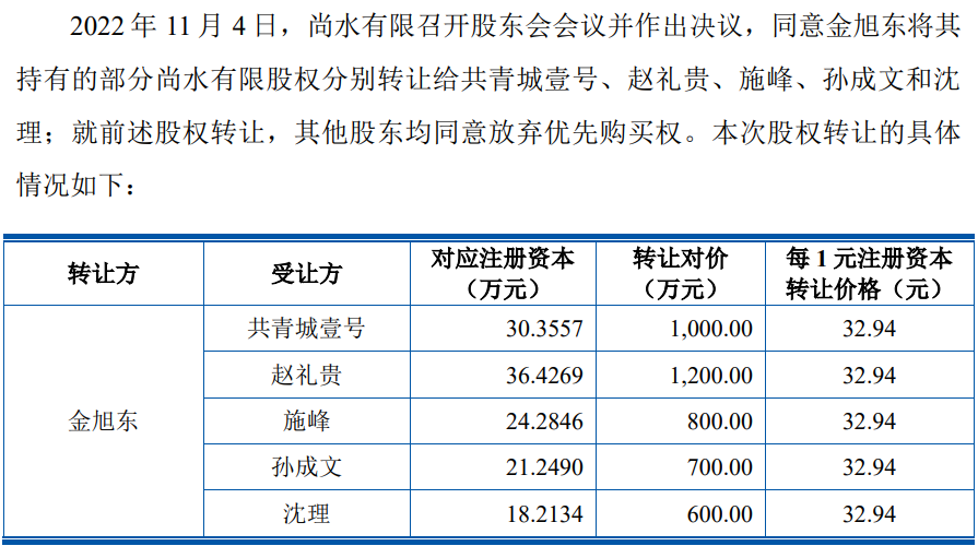 有意思的是,金旭东一边通过成为尚水商务执行事务人增强控制权,一边又在减持套现,报告期内,金旭东还通过转让股权套现5,100万元。