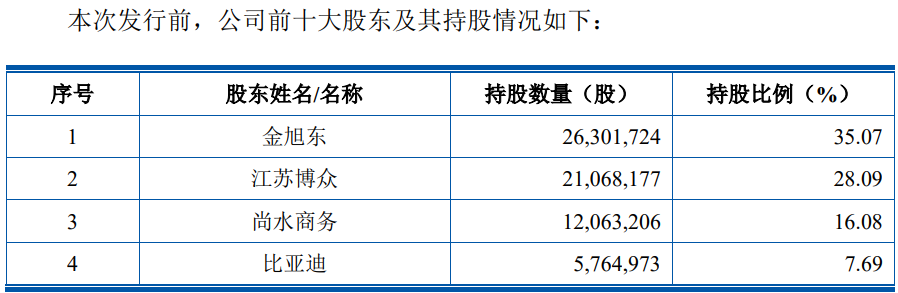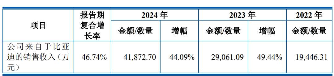 而报告期内,关联股东比亚迪则一直为发行人的最大客户,2022年-2024年,公司对其销售金额分别约分别为1.94亿元、2.91亿元和4.19亿元,占比分别49.04%、48.39%和65.78%,快速攀升,对其销售复合增长率高达46.74%,远高于同期收入26.70%的复合增长率。