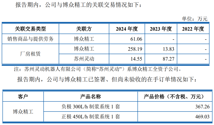 2023年、2024年,发行人向江苏博众控制的博众精工之间存在关联销售和厂房租赁的情况,对其在手订单为836.26万元。