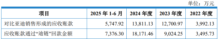 值得注意的是,公司较大的应收款项来自于比亚迪,2023年、2024年对其应收占整个应收余额的比例高达58%、86.87%,远高于同期收入占比,公司对其应收回款基本上通过比亚迪股下属深圳迪链科技有限公司(简称:迪链)。