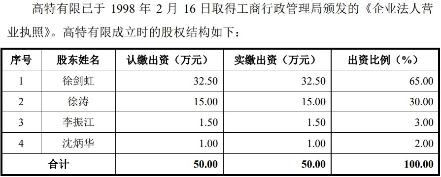 招股书披露,发行人前身高特有限成立于1998年2月,由自然人徐剑虹、徐涛、李振江、沈炳华共同出资设立,注册资本为50.00万元,不过,4名创始股东中,仅剩徐剑虹。