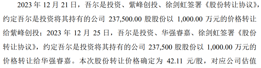 上述5次股转中,员工持股平台吾尔是投资于2022年4月、2023年4月和2023年12月,分别对外进行了3次股转,向华强睿华转让277,309股,向安芯同盈、邦信天使和芯泉天使分别转44,092股股份、22,046 股股份和7,349股股份,向紫峰创投、华强睿嘉分别转让237,500股、237,500股,分别套现1,000万、500万元和2,000万元,合计金额3,500万元。