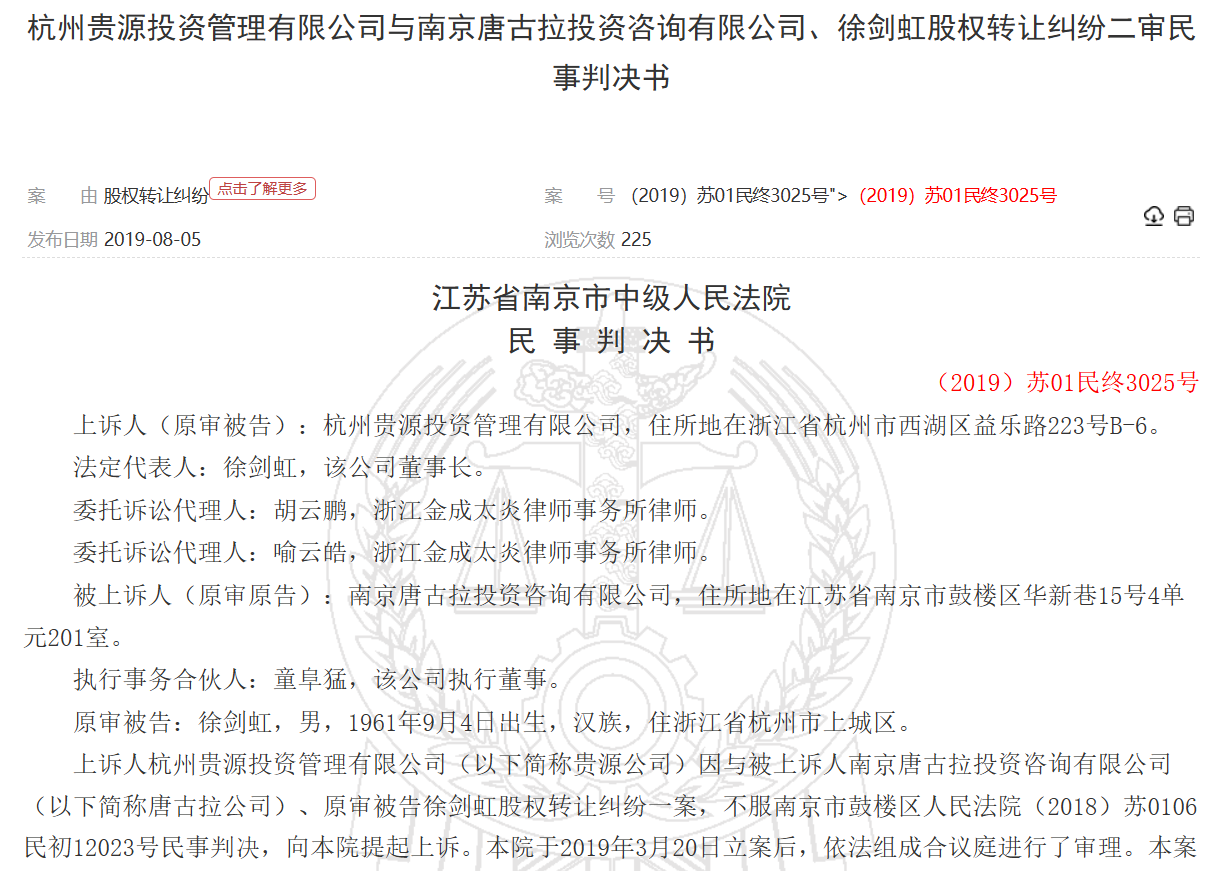 据(2018)苏0106民初12023号民事判决、(2019)浙0106民初5348号民事判决显示,2015年8月,2015年9月,杭州贵源投资管理有限公司(控股股东曾用名)曾与唐古拉投资、璞源投资签订股权转让协议,分别将其2%股权以60万元价格转让给唐古拉公司、6.1538%的股权以400万元价格转让给璞源公司,两家公司均出资到位,2018年6月,双方鉴于发行人经营业绩和未来发展战略与贵源公司的认识产生严重分歧,签订了《股权回购协议》,但控股股东未履行回购义务,并称《股权回购协议》无效,且作为丁方签字的徐剑虹不具有承担担保义务。不过,两起上述均被驳回,维持一审判决。