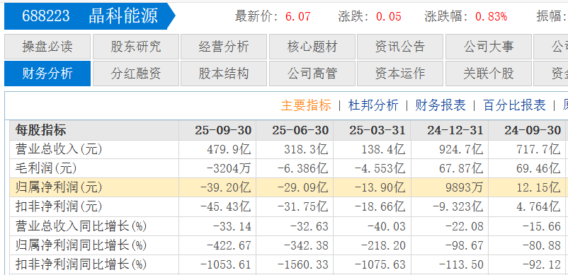 2024年,晶科能源出现了收入和利润的双重下滑,尤其是利润,扣非净利润还出现了9亿多的大幅亏损。2025年前三季度,该企业营业收入再次同比下滑33%,扣非净利润为-45.43亿元,亏损幅度进一步加大。