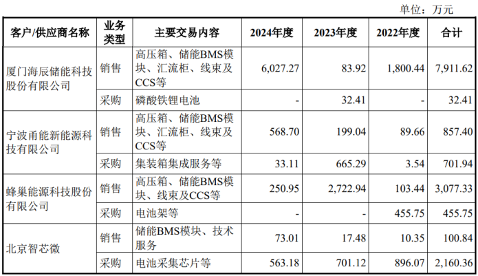 报告期内,发行人存在少量客户及供应商重叠的情况,向同一客户或供应商销售或采购金额较大的主要有海辰储能、甬能新能源、蜂巢能源和北京智芯微。