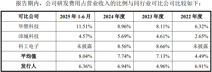 报告期内,公司研发费用分别为2,388.62万元、3,863.89万元、6,377.84 万元及3,227.98万元,占营业收入比例分别为6.91%、4.96%、6.94%和6.36%,低于同行平均水平。