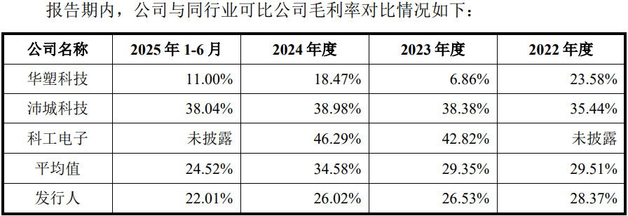 报告期内,公司主营业务毛利率分别为28.37%、26.53%、26.02%及22.02%,持续下滑,可对比同行的均值分别为29.51%、29.35%、34.58%和24.52%。