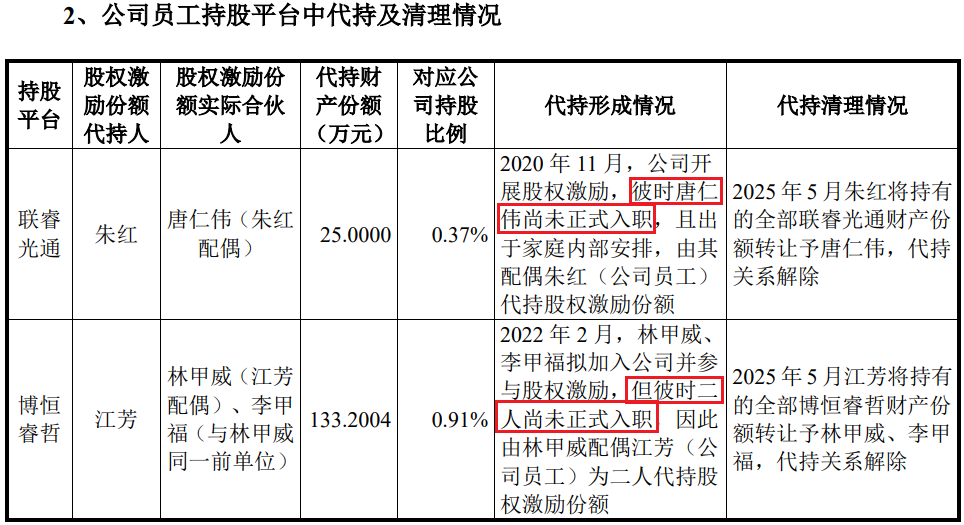 除了胡海洋曾找人代持股份,发行人历史上还曾发生过一次代持,代持原因是因为唐仁伟、林甲威、李甲福获得股权激励,但尚未入职公司,三个人持股由唐仁伟、林甲威配偶代持,直至IPO申报前才予以解除。
