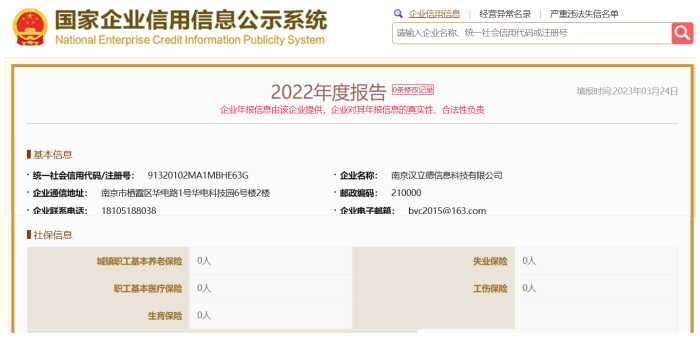 工商资料显示,该企业设立于2020年5月,作为生产型供应商,其参保人数一直为0。同时,2022年第一大供应商南京汉立德信息科技有限公司供应商参保人数也一直为0。