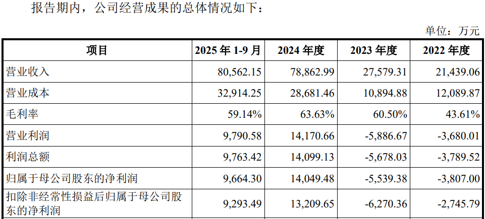 2022年至2025年1-9月,发行人营业收入为 21,439.06 万元、27,579.31 万元、78,862.99万元和80,562.15万元,净利润分别为-3,807.00万元、-5,539.38万元、14,049.48万元和9,664.30万元,扣非后净利润为-2,745.79万元、-6,270.36万元、13,209.65万元和9,293.49万元,2023 年亏损规模扩大,2024年扭亏为盈。2024年,净利润率17.82%,2025年前三季度净利率为11.20%。