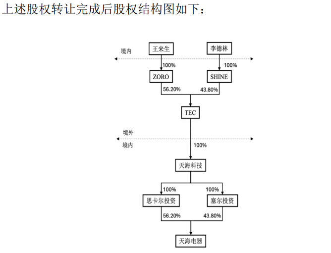 2006年9月,TEC收购天海科技,王来生和李德林与TEC签订《股权并购协议》,王来生和李德林将其持有天海科技股权全部转让给TEC,同时,为了保持境内外持股比例一致,Shine将其持有的TEC的部分股权转让给Zoro;转让后,Zoro 持有TEC的股权比例56.20%,Shine 持股占比为43.80%。