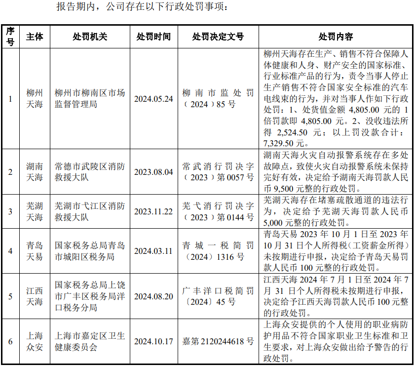经营方面,报告期内,发行子公司因生产、销售不符合保障人身健康和财产安全的国家标准的汽车电线束、火宅报警系统损坏、堵塞消防通道、未按期申报个税和不符合国家卫生健康卫生要求等出现了6起行政处罚。