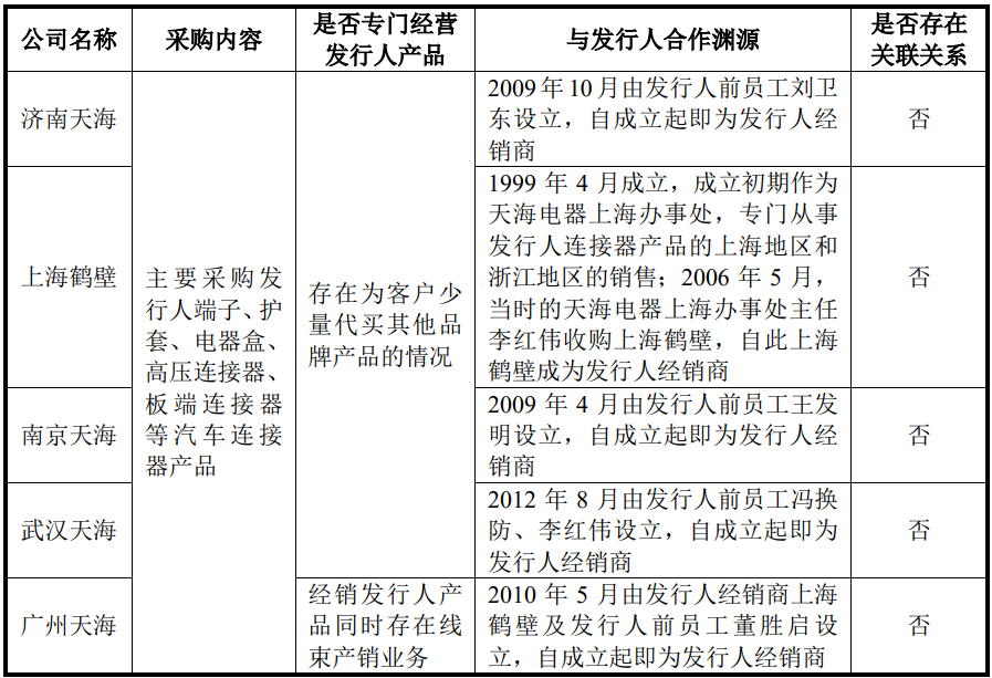 截至招股说明书签署日,公司共有五家经销商,分别为上海鹤壁电器有限公司、济南天海电器有限公司、南京鹤壁天海电器有限公司、武汉鹤壁天海电器有限公司、广州天海电器实业有限公司,而这五家经销商全部由发行人前员工设立。