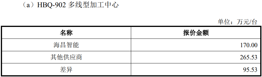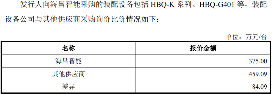采购价格方面,发行人对海昌智能的采购价格多数低于其他供应商,其中,HBQ-902多线型加工中心设备、HBQ-960新能源线束全自动加工生产线设备、装配设备和装配设备的采购价格较其他供应商分别低了35.98%、19.36%、18.32%和51.63%。