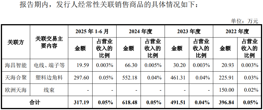 除了关联采购外,发行人对海昌智能、天海合聚和欧洲天海还存在关联销售,报告期累计向关联方销售金额1,824.02万元,金额及占比较小。