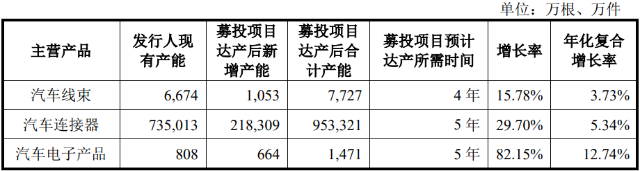 预计汽车线束、汽车连接器和汽车电子产品各新增15.78%、29.70%和82.15%产能。