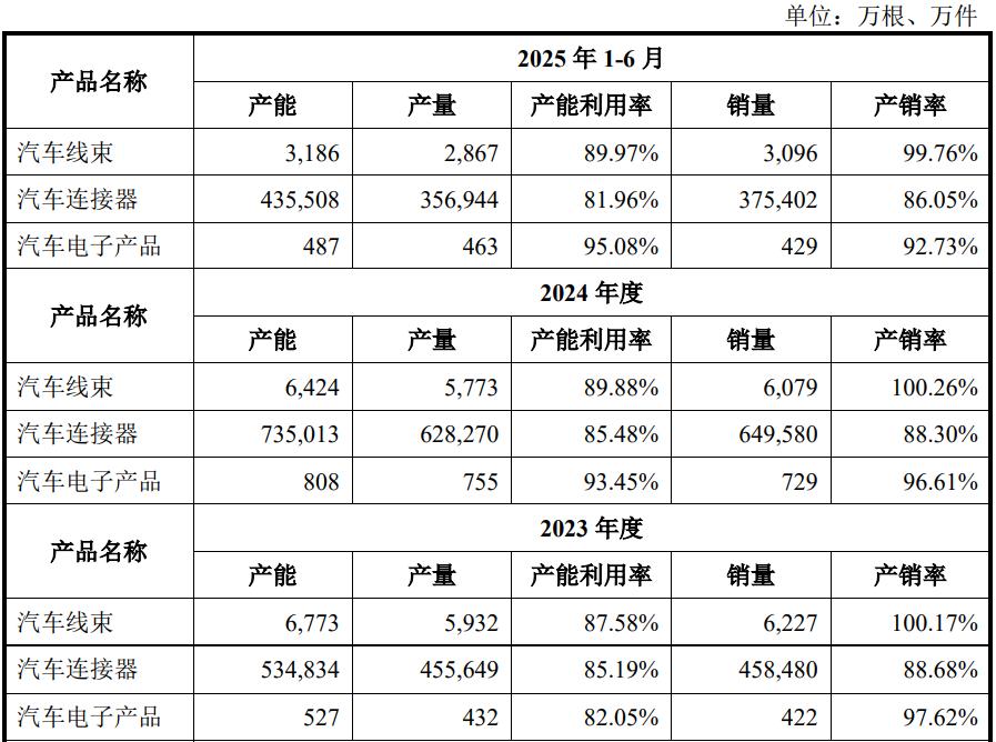 但从目前的产能利用率来看,均未达到饱和状态。2024年,公司的主要产品汽车线束产能、产量和销量还均出现了下滑,2025年上半年其产能、产量还未及2024年一半水平,继续呈现下滑态势,其销量也仅约2024年一半的销量。
