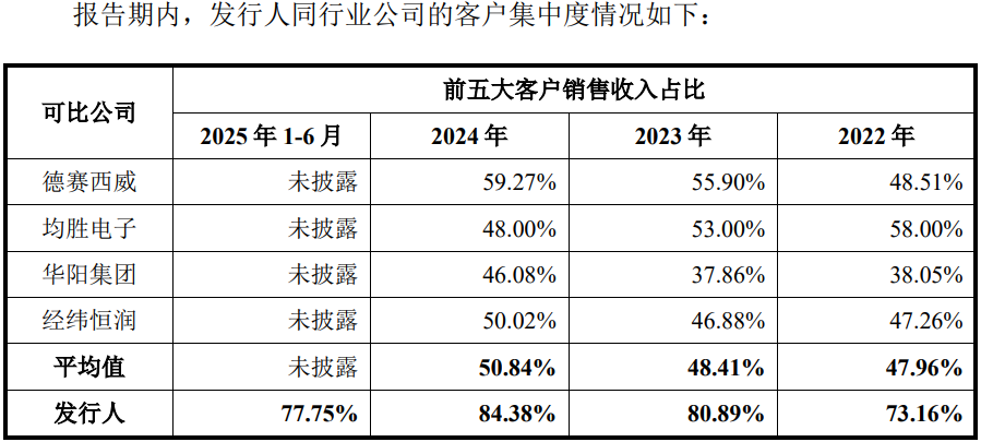 对比同行,2022-2024年,同行前五客户集中度分别为47.96%、48.41%、50.84%,大幅低于发行人约30个点。