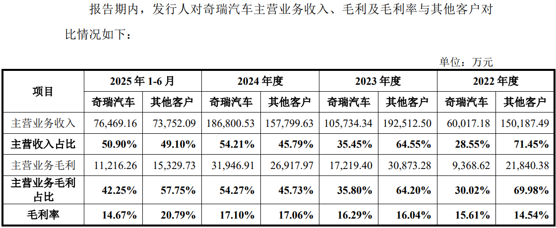 报告期内,发行人对奇瑞汽车的毛利均超过了30%,与其他客户对比,2022-2024年对奇瑞汽车的销售毛利率高于其他客户,2025年上半年显著低于其他客户。发行人表示,2025年1-6月,发行人对奇瑞汽车主营业务毛利率低于其他客户,主要原因系奇瑞汽车当期产品年降幅度较大所致。