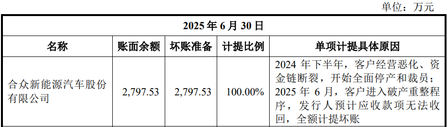 2022-2024年,公司累计对其销售约1.65亿元,均采用寄售的销售方式,2024年下半年,合众汽车出现了经营恶化、资金链断裂,开始全面停产和裁员;2025年6月,其进入破产重整程序,发行人对其2,797.53万元无法收回,全额计提坏账。