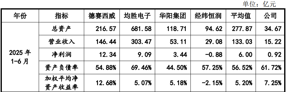 报告期内,发行人收入虽呈现不断增加,但经营规模与同行仍存在较大差异,截至2025年6月末,公司的资产总额为34.67亿元,同行均值为277.87亿元,同行中规模较小的经纬恒润资产总额为94.62亿元;2025年上半年发行人收入规模为15.22亿元,同行均值为133.03亿元,收入规模较小的经纬恒润收入为29.08亿元,近公司的两倍。